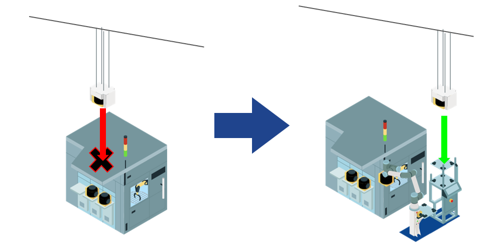 Problem: impossible machine loading by OHT (Overhead Hoist Transport).