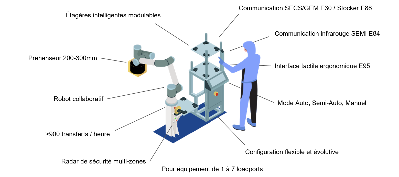 The SideLoader is a compact collaborative robot capable of automatically loading and unloading equipment. It extends the reach of automated transport vehicles (AMHS) that are unable to access the loadports of certain tools.